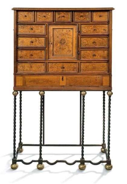 CABINET de forme rectangulaire, en marqueterie de bois indigènes de différentes couleurs à décor de rinceaux fleuris, feuillagés et animaux.Il ouvre par quatorze tiroirs encadrant une porte centrale et un large tiroir à la partie inférieure.