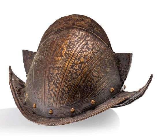 MORION à haute crête en métal repoussé garni de rivets. Le décor toutes fa