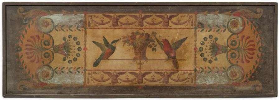 Toile rectangulaire peinte à décor dans le gout pompéien de bouquet fleuri, oiseaux dans des branchages, cygnes stylisées et guirlandes dans des réserves.