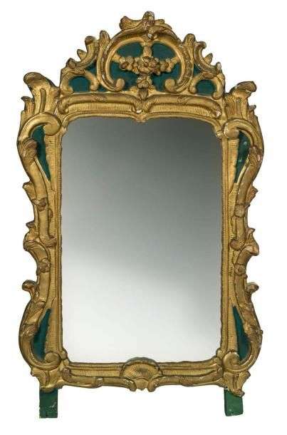 MIROIR en bois sculpté doré et laqué vert, le fronton à décor d'agrafes et d'une coquille fleurie. Le cadre orné d'entrelacs, coquille et fleurettes.