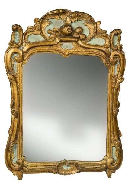 MIROIR en bois sculpté doré et laqué céladon, le fronton à décor d'une large coquille enserrant des fruits.