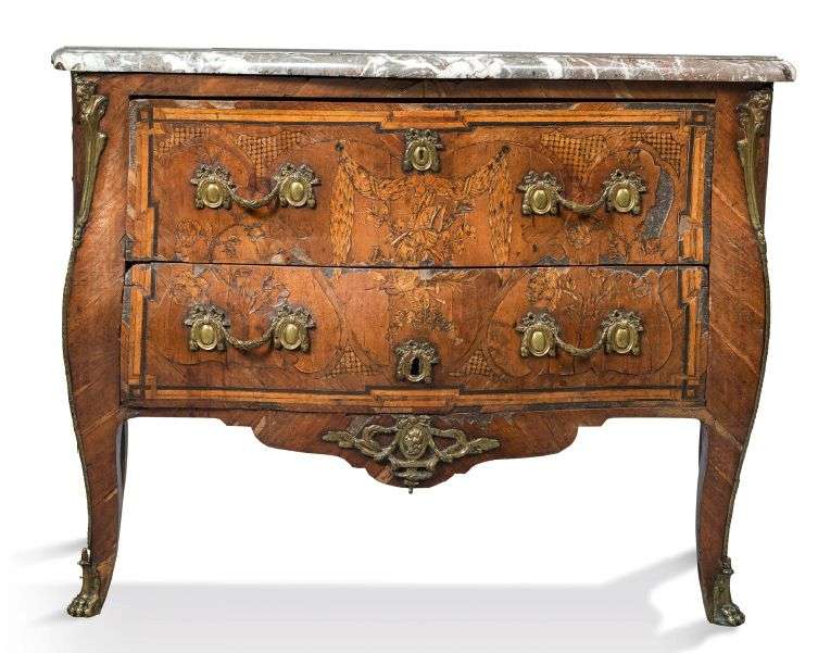 COMMODE de forme galbée en placage de ronce et marqueterie, elle ouvre par deux tiroirs en façade ornés d'instruments de jardinage, bouquets de roses et réserves. Ornementation de bronzes tels que: poignées de tirage, entrée de serrure, chutes et sabots.