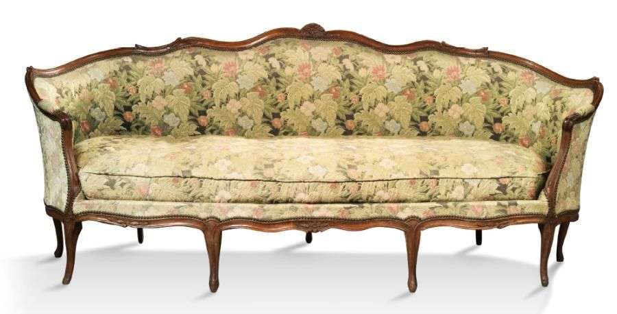 CANAPÉ CORBEILLE en noyer mouluré et sculpté, traverse mouvementée à décor de fleurs et fleurettes. Il repose sur neuf pieds cambrés.
