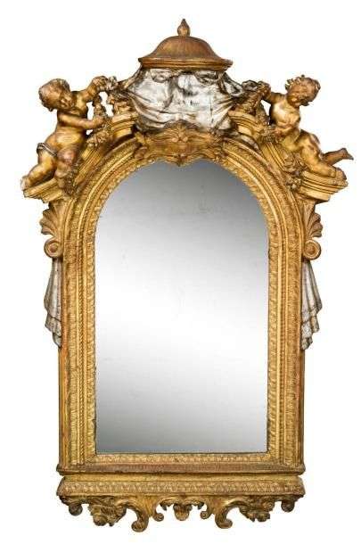MIROIR en bois sculpté doré et à la mecca orné d'enfants retenant la draperie du fronton en forme de baldaquin. Cadre à décor de feuilles d'eau et feuilles d'acanthe.