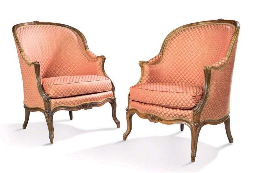 PAIRE DE BERGÈRES à dossier corbeille en bois naturel mouluré et sculpté d