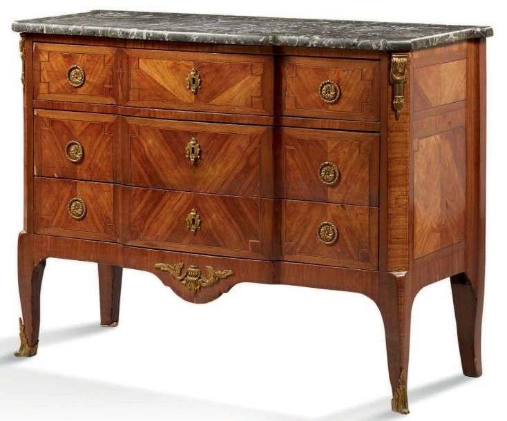 COMMODE à léger ressaut central en placage de bois de rose dans des encadrements d'amarante. Elle ouvre par trois tiroirs en façade, montants à pans coupés et pieds cambrés.