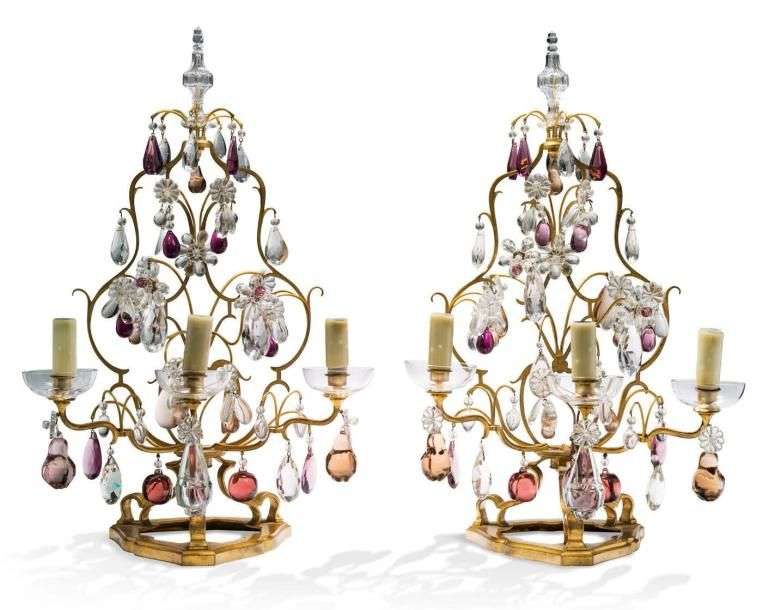 PAIRE DE DEMI-GIRANDOLES en bronze ciselé et doré à trois bras de lumières, le fût ajouré en arabesque est orné de pendeloques de fleurettes et demi-poires en cristal taillé de couleur dont certain améthysté.