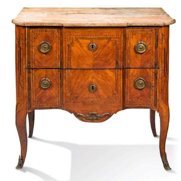 COMMODE à léger ressaut central en marqueterie de bois de rose et filets à grecques et bandes alternées.