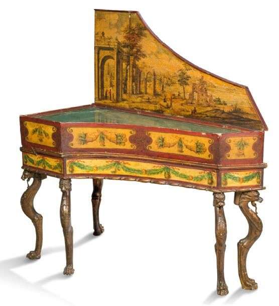 RARE ÉPINETTE en bois peint polychrome à décor d'amours tenant des paniers de fruits encadrés de guirlandes feuillagées et d'oiseaux. La ceinture à dédor de guirlandes de laurier rubanné. Elle repose sur six pieds en bois sculpté et doré à têtes de griffons se terminant par des pieds griffes. L'abattant découvre à l'intérieur un décor architecturé et se soulève pour former vitrine.
