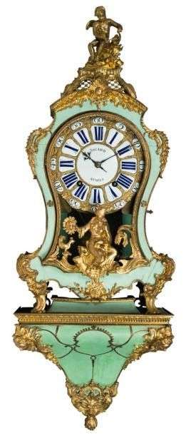 CARTEL en bois laqué vert et bronze ciselé doré au "C" couronné (1745-4749). Le cadran Signé JOUARD à Paris présente les heures en chiffres romains dans des cartouches émaillés bleu et blanc. À l'amortissement un petit édicule est surmonté de l'Amour et dans la partie inférieure, l'Aurore et un coq. Riche ornementation d'agrafes et enroulements.