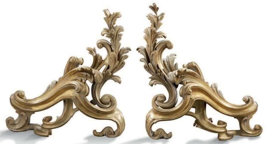 PAIRE DE CHENETS en bronze ciselé et doré à décor de volutes et acanthes.