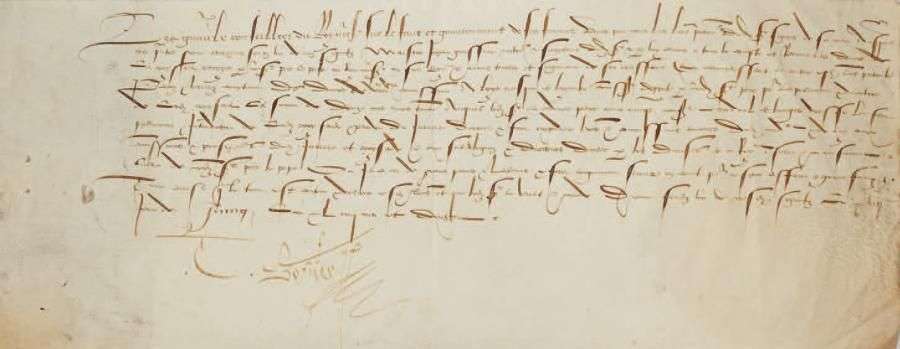 Pièce de parchemin, signée «T. Boyer», daté 18 juin 1518, 10 lignes, écriture cursive de cancellerie. Dimensions: 350 x 150 mm.