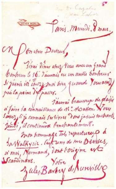 Ecrivain, dandy. L.A.S. au docteur (Cazalis). Paris, mercredi 8 mars. 1 pp. bi-feuillet in-8, en-tête en coin «Never more», encre rouge.