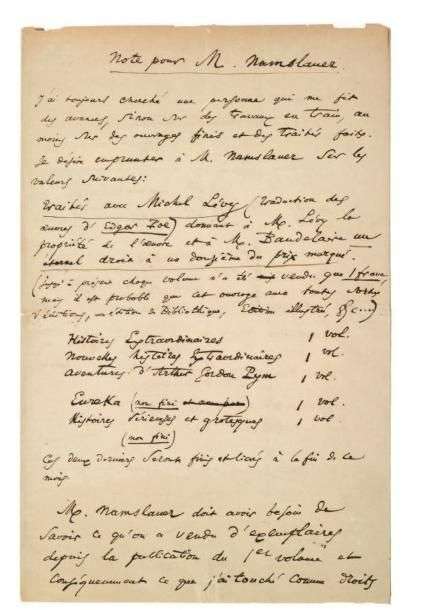 Important memento à son banquier, pour solliciter un prêt sur le produit de ses ouvrages dont les Fleurs du Mal. J'ai toujours cherché une personne qui me fît des avances, sinon sur des travaux en train, au moins sur les ouvrages finis et des traités faits (...). Il présente en détail les conditions auxquelles il a fait ses différentes publications: Traité avec Michel Lévy (traduction d'Edgar Poe) donnant à M. Lévy la propriété de l'oeuvre et à M. Baudelaire un éternel droit à un douzième du prix marqué (jusqu'à présent chaque volume n'a été vendu que 1 franc mais il est probable que cet ouvrage aura toutes sortes d'éditions, édition de bibliothèque, édition illustrée, &c. (...). Il poursuit avec ses traductions de Poe dont les Histoires extraordinaires, Eurêka, Histoire Sérieuse et grotesque, proposant à Namslauer le compte des volumes vendus qu'il doit livrer à la fin du mois et de ses droits d'auteur| l'éditeur Lévy pourra lui dire de quelle estime cet ouvrage jouit à la librairie. Il en vient ensuite à ses traités avec Hetzel, qui donnent à l'éditeur l'exploitation pendant cinq ans des Fleurs du Mal (3e édition, augmentée) et du Spleen de Paris, (pour servir de pendant, non fini, sera fini à la fin du mois), moyennant six cents francs par tirage de 2 000 de chaque volume. Tous mes traités sont à Honfleur, chez moi.