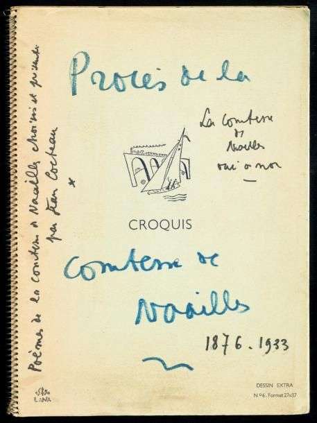 * Manuscrit autographe signé, Préface, octobre 1962, correspondant à la Préface (sans titre) du volume (p. 13-16), suivi de Notes intégrées dans la section «Notes» du livre (pp. 93-94, 97- 98) et d'un plan sommaire du volume avec des essais de titres. La couverture porte trois essais de titres: «Procès de la comtesse de Noailles 1876-1933», «Poèmes de la comtesse de Noailles choisis et présentés par Jean Cocteau» et «La Comtesse de Noailles oui ou non» (cahier de dessin grand in-fol. à spirale de 10 plus 2 pages in-4 de sa main et 2 ff. imprimés de l'épître dédicataire du Voyage de Sparte de Barrès collés dans le cahier).