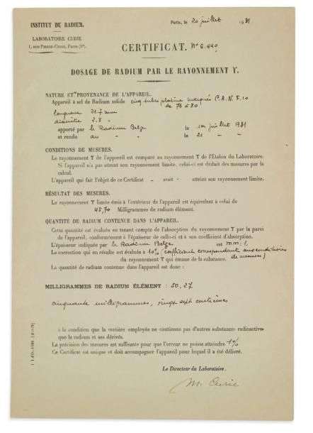 Certificat de radium par rayonnement gamma établi par Marie Curie comme directeur du laboratoire, sur un échantillon de radium belge, avec les mesures et résultat de coefficient.