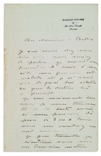 Emouvante lettre de Monet demandant le soutien de Bellio et évoquant ses travaux. Il demande de lui avancer 3 ou 4 louis, avant d'ajouter| De la Collection Max Thoren.