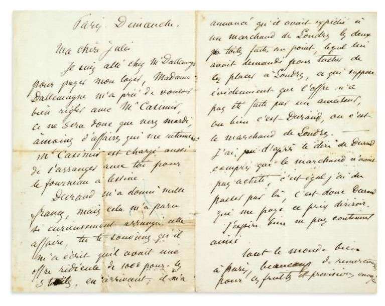 L.A.S. à sa femme Julie. 2 pp. ½ in-8 sur bi-feuillet.