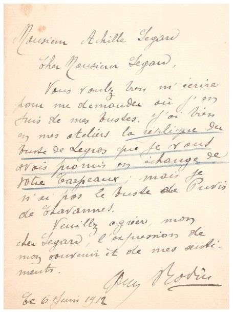 A propos d'une commande d'un buste de Legros que Rodin avait cédé en échange d'un de Carpeaux: octobre 1911: Rodin lui demande sa restitution. Il a réceptionné le buste qu'il va rendre au Musée. Quant à sa demande de lui donner un buste de Puvis de Chavanne à la place de Legros, il a déjà commandé spécialement pour lui une réplique de Legros| dès qu'il sera prêt, il lui enverra à son adresse. Juin 1912| Il vient de recevoir de ses ateliers, la réplique du buste de Legros promis en échange de son Carpeaux. 1915: Rodin a lu sa lettre avec beaucoup d'émotion| il précise que le buste de Legros a été envoyé au musée de Bruxelles Il lui enverra des nouvelles plus précises prochainement| il avoue ne pas quitter Meudon et allant très peu à Paris.