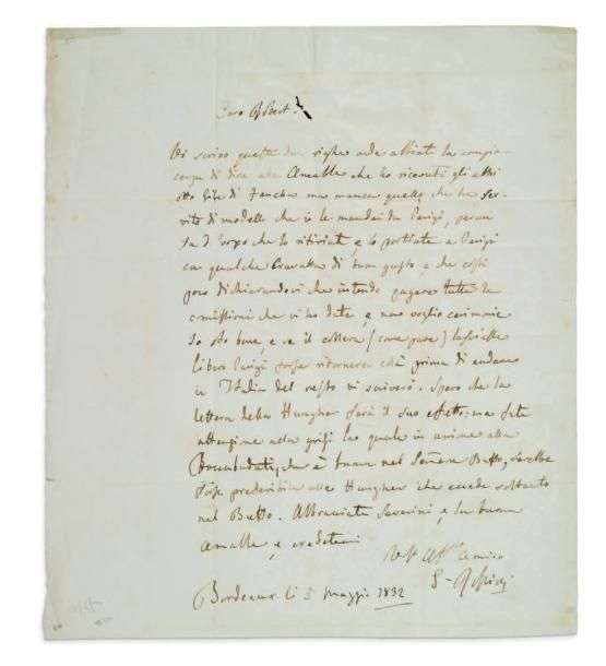 Très belle lettre de Rossini évoquant le choix des cantatrices pour son répertoire. Il écrit à son correspondant cette lettre pour qu'il informe «Amallie» qu'il a bien reçu les 8 autres vestes mais que celle qu'il a envoyée comme exemple à Paris est manquante. Il demande de la lui rapporter de Paris, indiquant qu'il remboursera le service. Il propose à Méric [la cantatrice Henriette Meric-Lalande] de séjourner à Paris, envisageant de venir dans la Capitale avant qu'il ne retourne en Italie| dans tous les cas, il lui écrira pour le prévenir.