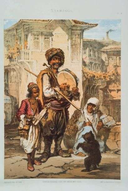 19 des 28 chromolithographies par Preziosi contrecollées parues dans L'Encyclopédie des arts décoratifs de l'Orient. Il constitue la réimpression de la série publiée en 1858 (qui comprenait une planche de plus): personnages gracieux, vêtus de couleurs vives dans des scènes de rue diverses: pêcheurs sur les bords du Bosphore, femme à la fontaine, jeune femme fumant le narghilé, derviches tourneurs, eunuques...