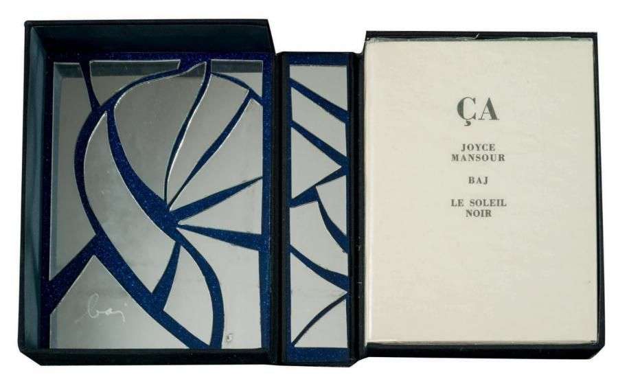 P. Soleil Noir 1970. pet. in-8 (195x140) broché couverture rempliée, contenu dans un étui-boîte noir recouvert de miroirs avec le mot Ça en grandes lettres coloriées sur chaque plat et le dos, intérieur doublé de fragments de miroir brisé signé.