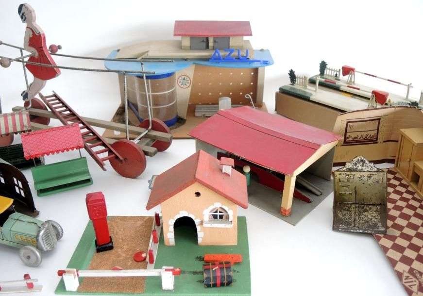 Lot de jouets en tôle, bois et carton, dont partie de garage – hangar d’aéroport – cuisine – aiguillages LR – garage AZUR avec voiture MEMO.