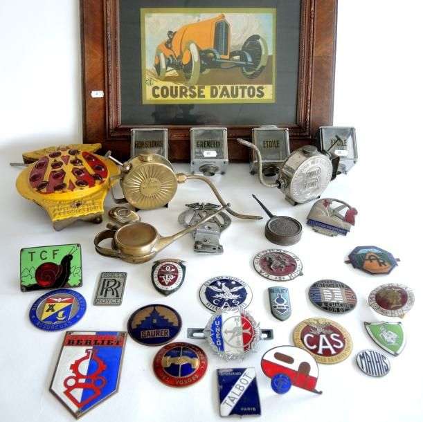 Lot divers d’accessoires automobiles dont burette d’huile RENAULT – lanternes de taxis « ETOILE « HOPITAL ST LOUIS » « GRENELLE » - enseigne murale en fonte de l’AUTOMOBILE ASSOCIATION » - petites plaques émaillées sur les constructeurs automobiles, dont ROLLS ROYCE – RENAULT – SALMSON – TCF – FORD – PEUGEOT – HOTCHKISS – BERLIET (+ de 40 p.).