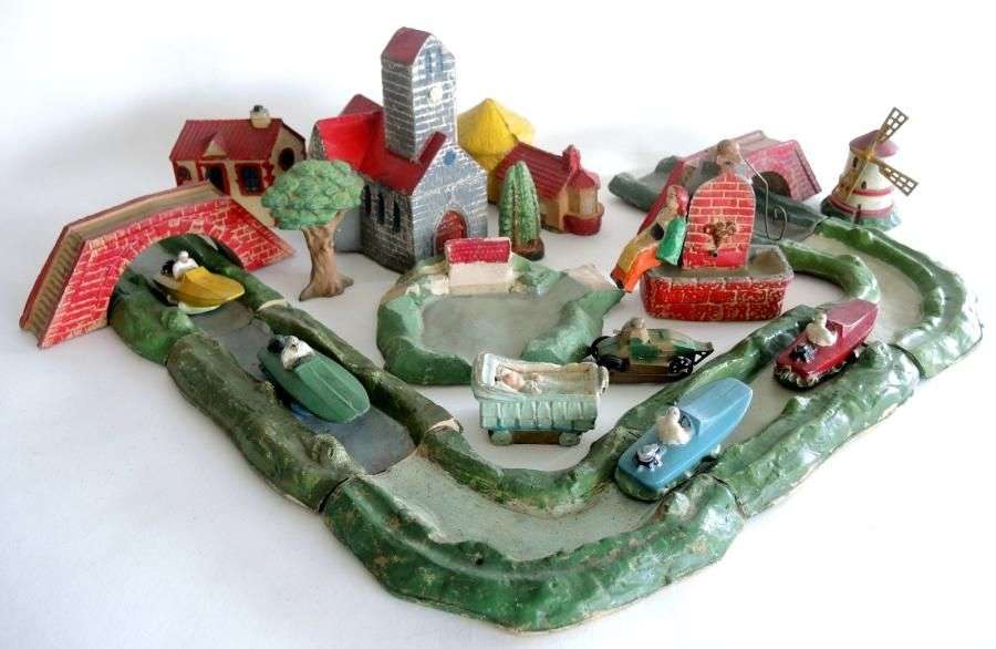 Lot de décors divers en plâtre et farine avec ponts – puits – mare – moulin – église – piste – maison.