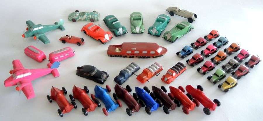 Jouets celluloïd divers, figurant avions – bateaux – Cabriolets – Berlines – voitures de course – camions – PEUGEOT 402 et voitures JF mécanique (+ de 70 p.).