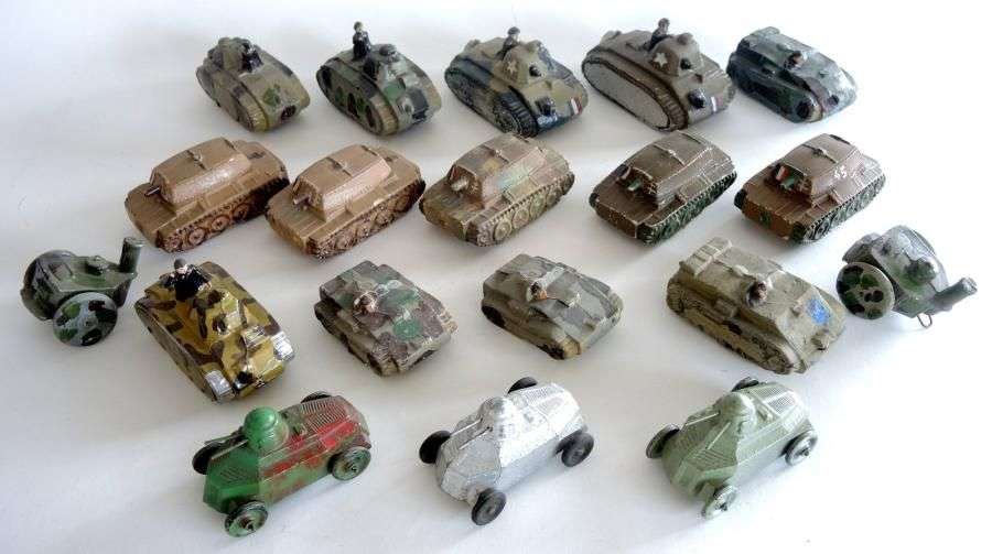Lot de tanks et cuisines roulantes en plâtre et farine, véhicules blindés de la 1ère et 2ème guerre mondiale (+ de 30 p.).