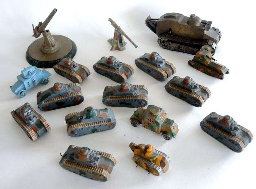 Lot comprenant tank RENAULT mécanique en laiton, 1ère guerre mondiale – canons de forteresse – petits engins blindés en plomb et tanks JRD de camouflage (+ de 20 p.).
