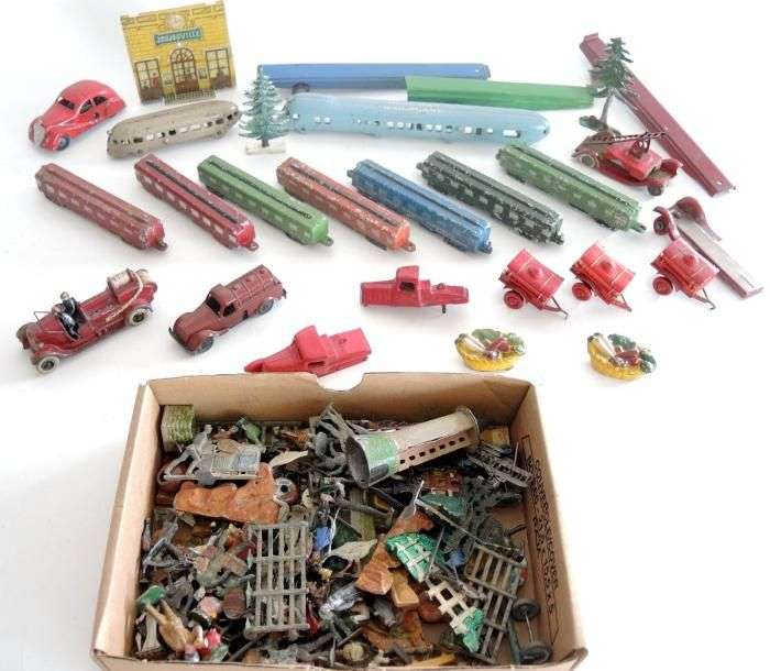 Lot divers comprenant accessoires en plomb – train en fonte et composition – montgolfière de dioramas – personnages de gare – remorques de voitures en tôle – partie de voiture de pompiers CITROEN et petit train en aluminium.