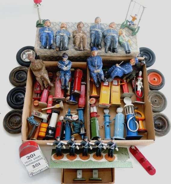 Accessoires divers dont pompes à essence en plomb et COFALU – personnages de chargements militaires JRD – agents de Police – militaires en composition – roues CIJ et jouets de bazar en plomb.