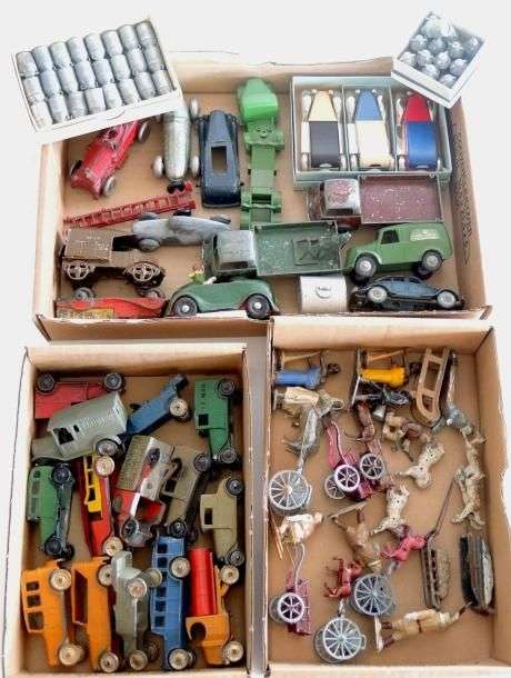 Lot divers de bidons de lait – personnages en plomb creux sur le thème de la luge – la chasse à l’ours blanc – voitures de course en fonte – voitures SOLIDO – camion TOOTSIE TOY.