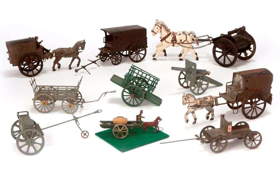 Lot de jouets divers en tôle et tôle crochetée comprenant charrette attelée – partie de train d’artillerie – fourgon attelé CR – fourragère – civil et militaire.