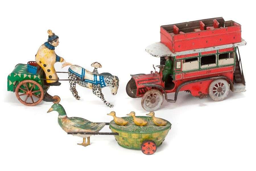 Autobus à impériale en tôle lithographiée, mécanique (qq. manques dont cal