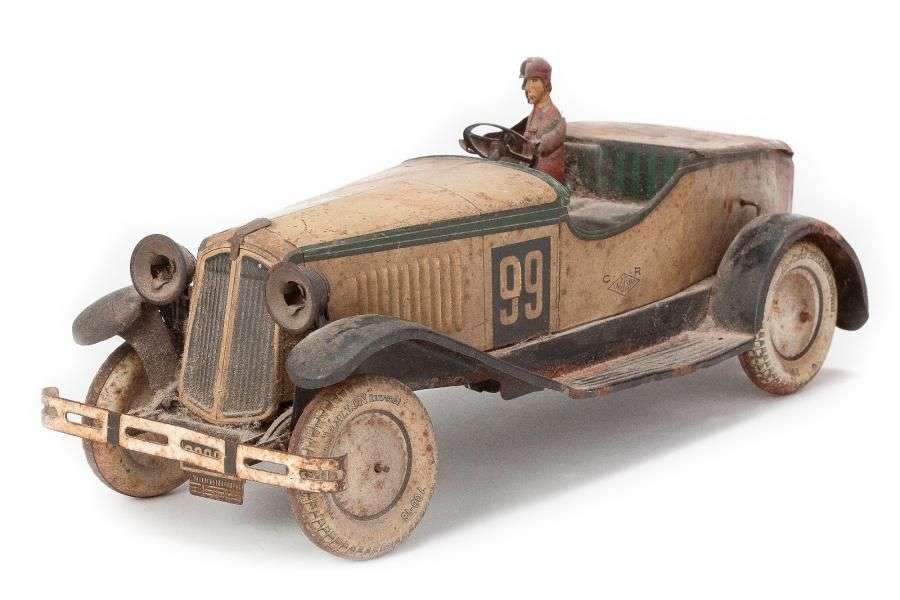 C.R. : Voiture de course mécanique, avec chauffeur, réf. 2000 S, tôle lithographiée en mauvais état (manque une roue) L=37cm.