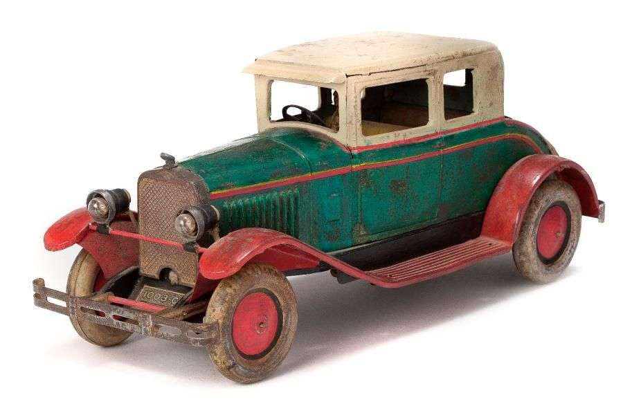 C.R. : Coach DELAGE, avec coffre arrière, réf. 1003, mécanique, bicolore vert et crème, filets rouges, phares éclairants. Etat moyen, moteur incertain, L=36cm.