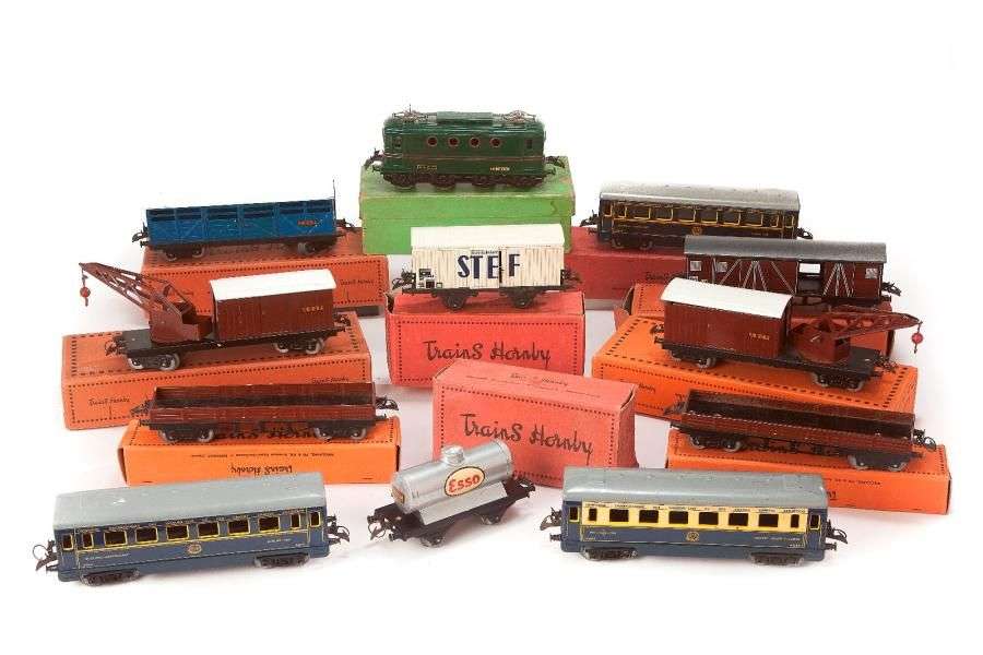 HORNBY « O » : lot de matériel ferroviaire comprenant BB 8051 électrique SNCF – 3 voitures CIWM n° 4218 – 4025 – 5 wagons marchandises dont couvert – bestiaux n° 2 – réservoir ESSO – wagons de secours avec grue (x2).