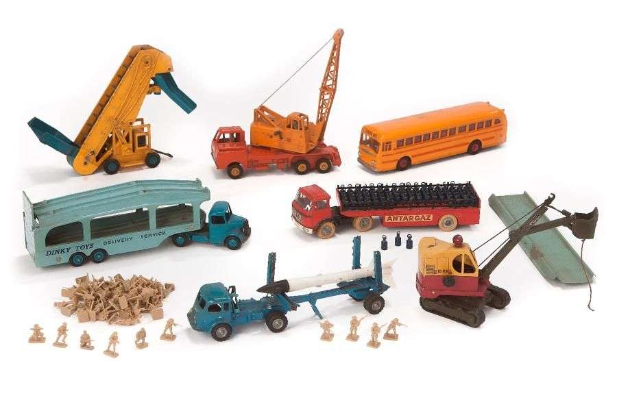 Lot de véhicules, dont PRIMAGAZ CIJ – porte voitures PULLMORE – engins de chantier – autobus – Ecole US.