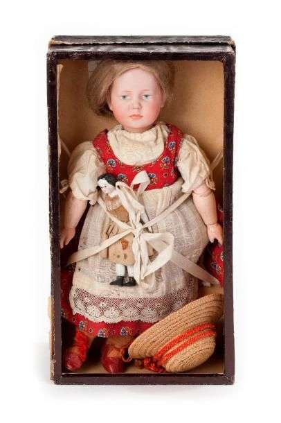 Bébé à tête caractérisée, allemand, avec tête en biscuit, bouche fermée, yeux peints, marquée « KR 101 » corps articulé d’origine de type Toddler, habits anciens, H=30cm.