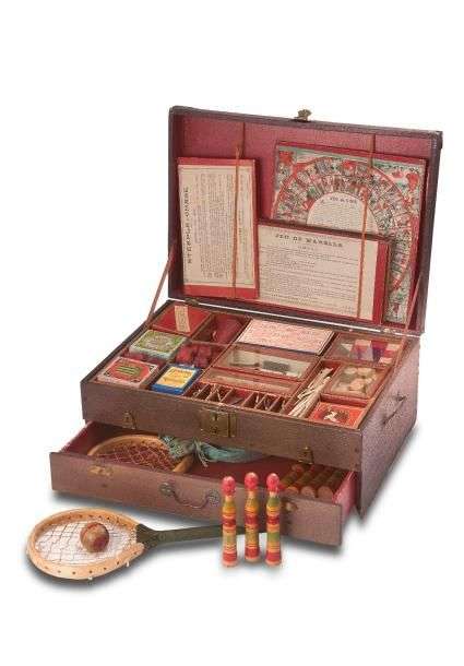 Coffret de Jeux Réunis « JEUX » Breveté VP SGDG comprenant divers casse- tête – Jeu de l’Oie – Loto – Steeple Chase – Dominos – Quilles – Jonchets en os.