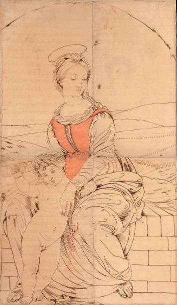 La Vierge des Moissons peint par Delacroix en 1819 pour l'église d'Orcemont (actuelles Yvelines), (voir P. Georgel, Tout l'oeuvre peint de Delacroix, Paris, 1975, n° 17, reproduit). Il s'agit là de la première commande reçue par le jeune peintre. Le commanditaire était un grand propriétaire terrien de la région, Jacques Gouffier, ce qui explique les connotations «agricoles» de notre oeuvre. On y trouve également des références à La belle Jardinière de Raphaël, pour qui Delacroix, encore élève aux Beaux - Arts, avait une vraie passion.