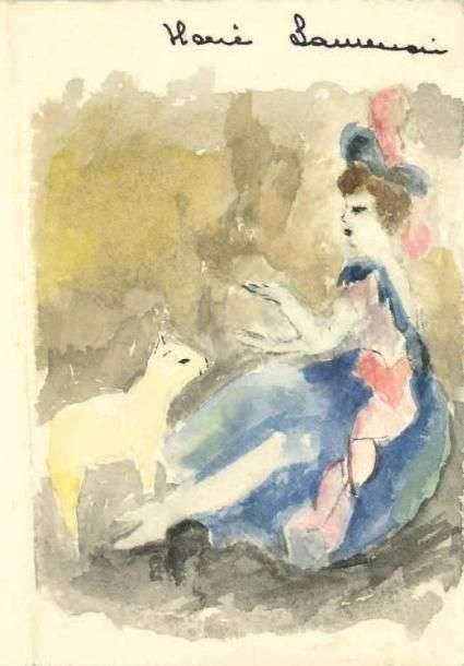 Dessin à l'encre aquarellé représentant une femme près d'un agneau au recto de voeux autographes également signés par elle.