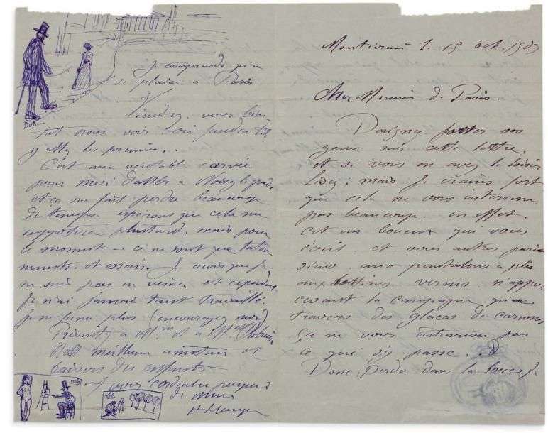 L.A.S. avec 4 dessins, Montévrain (Seine-et-Marne) 15 octobre 1909, à un ami peintre [Dubuis ?]| 4 pages in-8 à l'encre violette (petit manque dans le haut sans perte de texte).