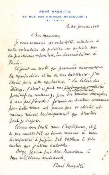 EXPOSITION sur le Surréalisme prévu à Paris. Il choisit pour reproduction son tableau La Colère des Dieux: «... Il y a me semble-t-il de bonnes raisons à mon incapacité à préférer tel tableau à tels autres que j'estime valables ...»