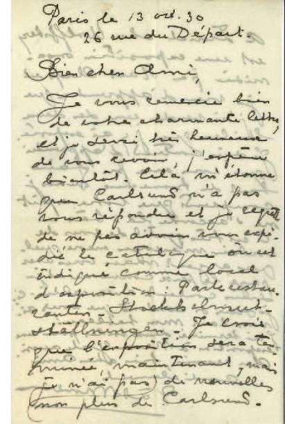 L.A.S à M. WOLFFBERG, Paris, 13 octobre 1930 2 pages in-8