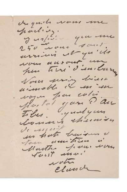 L.A.S. «votre Claude», [Antibes] Jeudi midi [février 1888], à Alice HOSCHEDÉ| 2 pages in-8 (légères fentes).