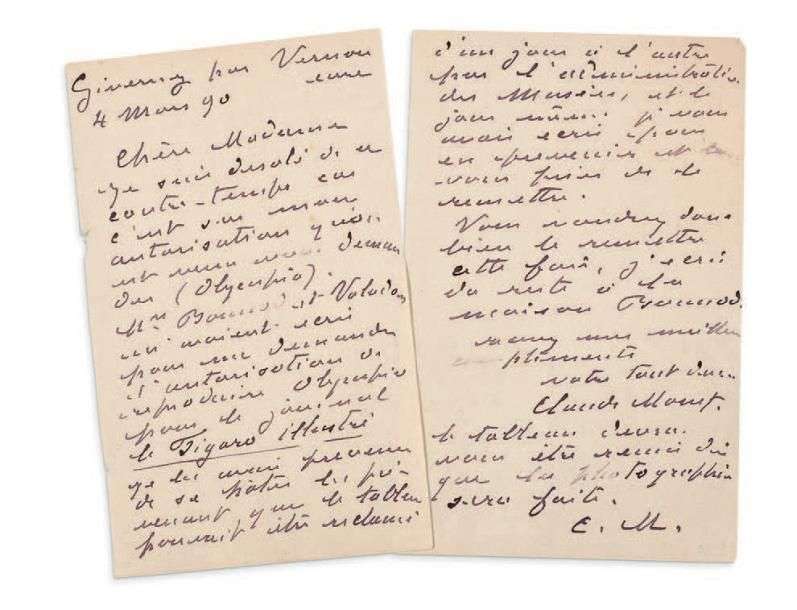 L.A.S., Giverny 4 mars 1890, à Suzanne MANET| 2 pages in-8 à l'encre violette (légères fentes).